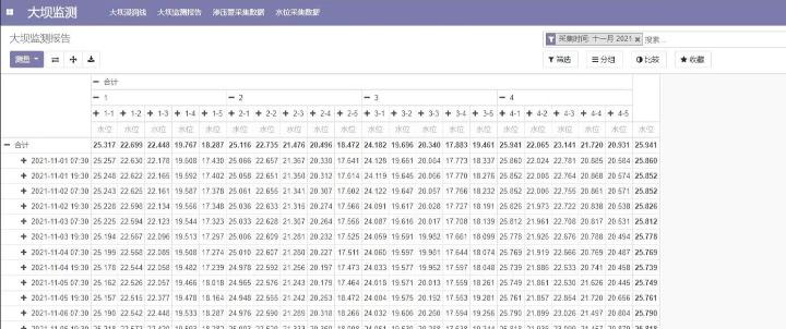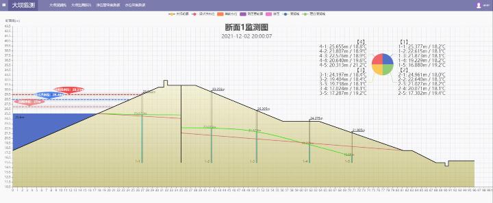 系统基于odoo V14社区版,结合echarts组件,通过设置断面、测压管、大坝轮廓等基础数据,定时采集库区水位、测压管压力数据,自动绘制大坝浸润线,并对实际浸润线与理论浸润线同步展示,方便对比分析。
