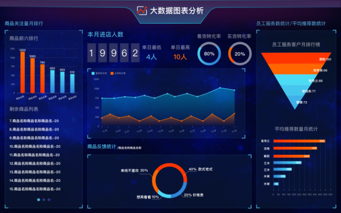 通过智能看货盘、人脸识别摄像头等数据的抓取,建立顾客进店、产品关注、店员服务、商品反馈等大数据平台,开展销售漏斗分析与销售预测。